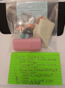 Open the ziplock bag. You will see a pink container and two ring assemblies (a black ring and a red silicone ring). Clean the plunger and ring assembly using two separate presaturated pads with 70% isopropyl alcohol.